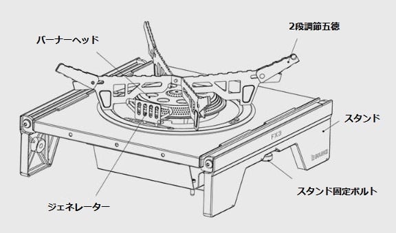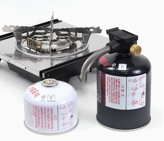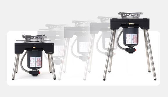 イソガス450・230gが使用でき、ガス容器の交換も容易です。強火力が必要な時は液出し方式で使用できます。延長脚使用時は、下段にイソガスをセットする場所があり、便利に使用できます。