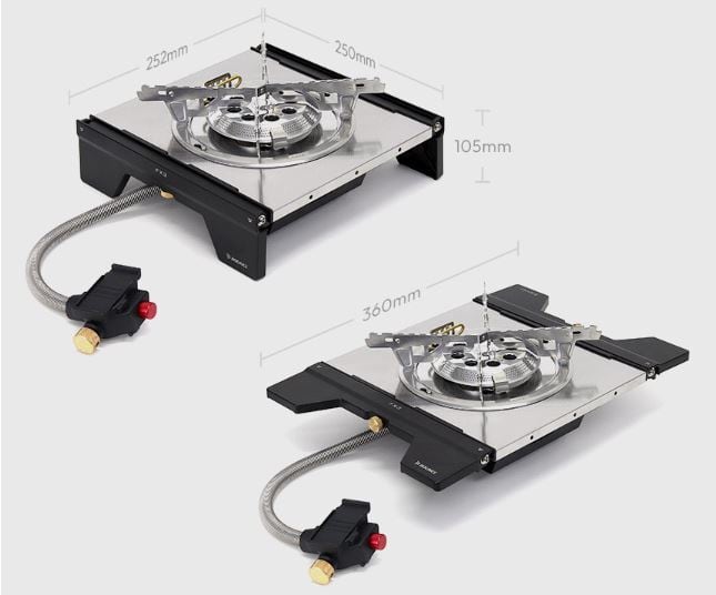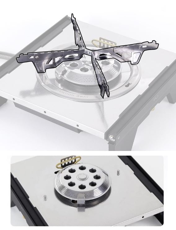 風がある野外でも火力を安定的に維持し、手軽で正確な点火と火力調節が可能です。風除けは取り外しでき、エンボス加工のステンレス仕様で、衛生的に管理できます。