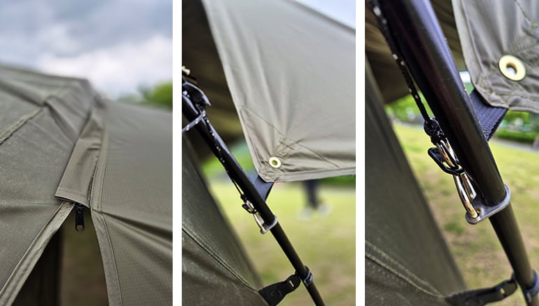 設置方法:ルーフフライのファスナー部分にタープを設置し、