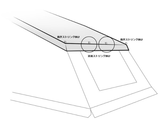 タープ後面部にストリング掛け2個が追加されました。 雨天時、リングにストリングを接続した後、テンションをかけてください。