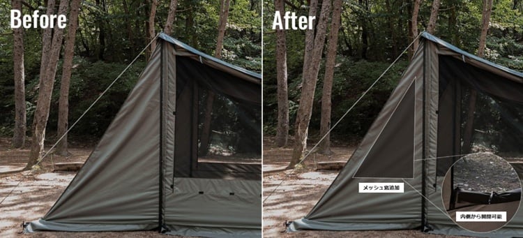 ベイカーエアーテント2Pは、スクリーンウォール前面の三角形サイド部分に三角メッシュ窓が追加されました。