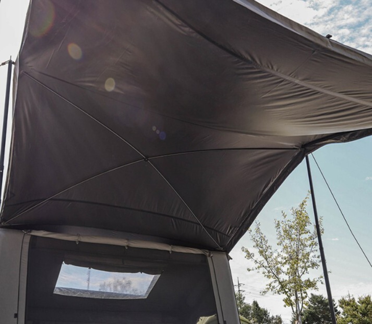 ・ジッパーで連結できるPU10,000mmのタープはポリ素材仕様で、内側にはブラックコーティングを施し、より便利に使用することができます。ジッパーはテントの前から後ろにつなげて下さい。タープの上にはウレタン窓があり開放感があります。