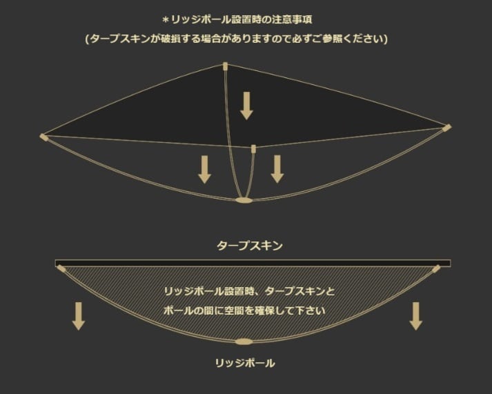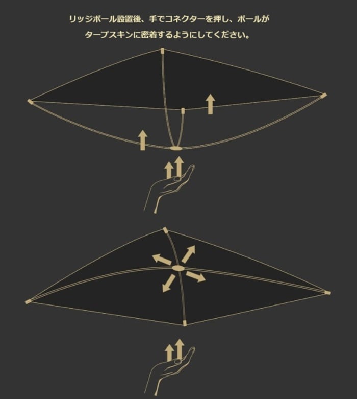 追加された一体型X字コネクタ型リッジポールは、タープの上面の形を揺らぎなく整え、容易な設置で雨天時に有用に使用できます。