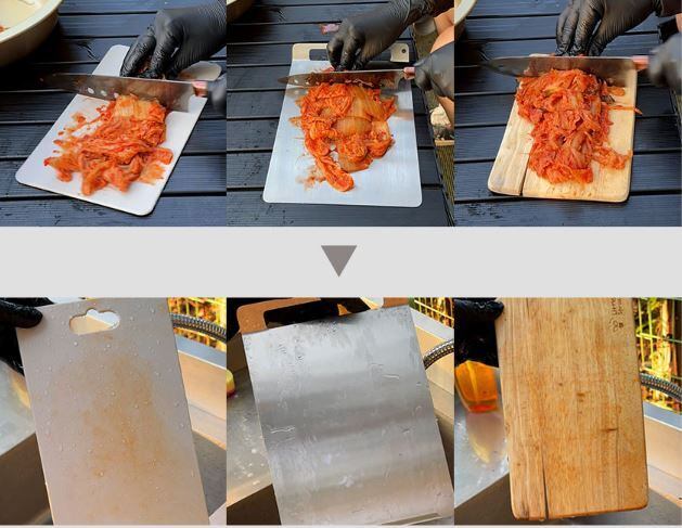 まな板としても、プレーティングプレートとしても使用でき、厚さ1.5Tステンレス304素材で耐久性に優れ、軽くて衛生的に使用できます。