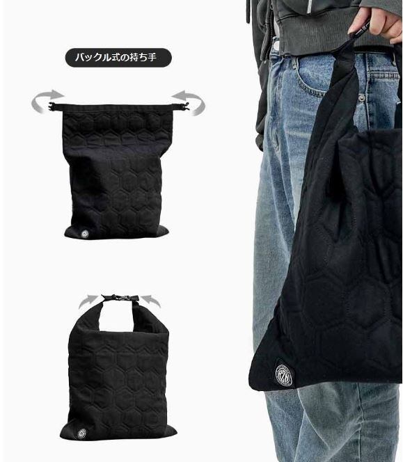 ・ベルクロでロールバッグの入り口を閉じた後、上部を丸めてバックルを留めれば、持ち手のようになり、実用的に使用できます。