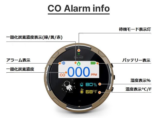 ⑤自動バックライトOFF:節電モードで1分間触らずにいると、自動でバックライトが消え待機モードになります。待機モードでも2秒毎に一酸化炭素濃度は測定されており、ボタンを押すとバックライトがつきます。