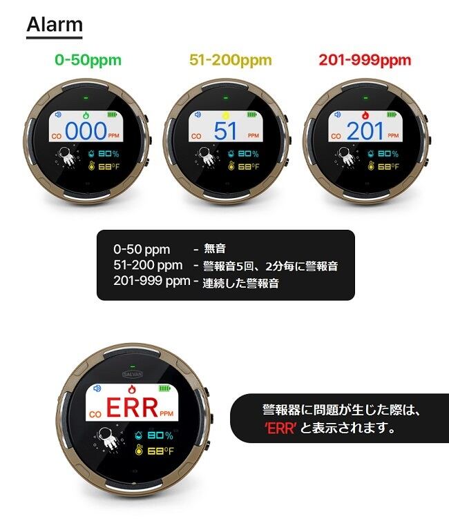 SALVANデジタル警報機:電気化学式センサー/アメリカUL2034安全認定済/測定間隔2秒/1000mAh/80db/温湿度測定あり/高画質デジタル画面/温湿度測定/防水防塵等級
