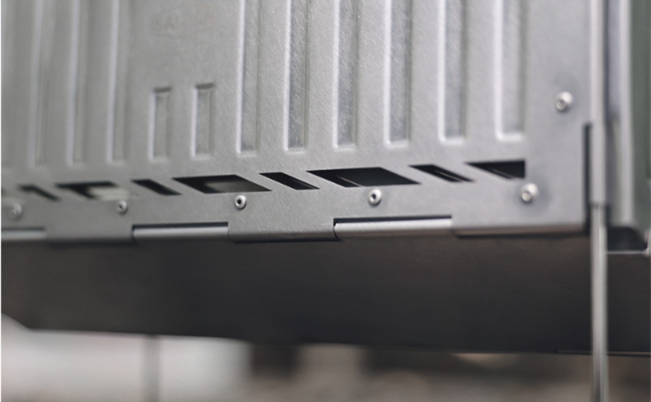 ヴィンテージ感のあるコンテナデザインで、ワンアクション構造の手軽に設置できる焚き火台です。二重燃焼構造で焚き火やBBQを楽しめます。