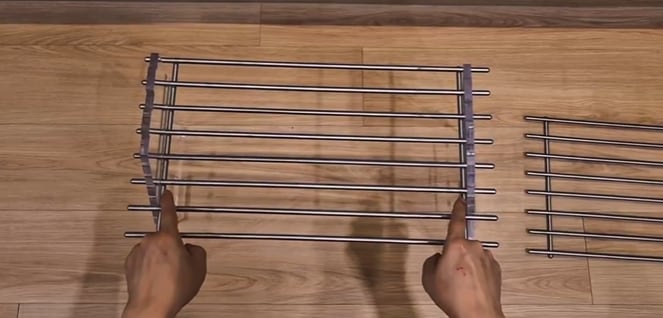 *ステンレス棚をはめる際、左右の横の棒に密着するようにはめ込むとぐらつきが少なくなります。(写真11.12)