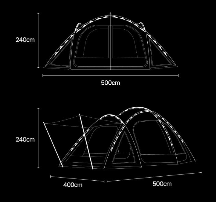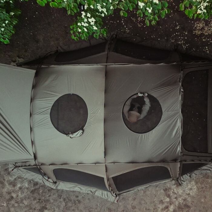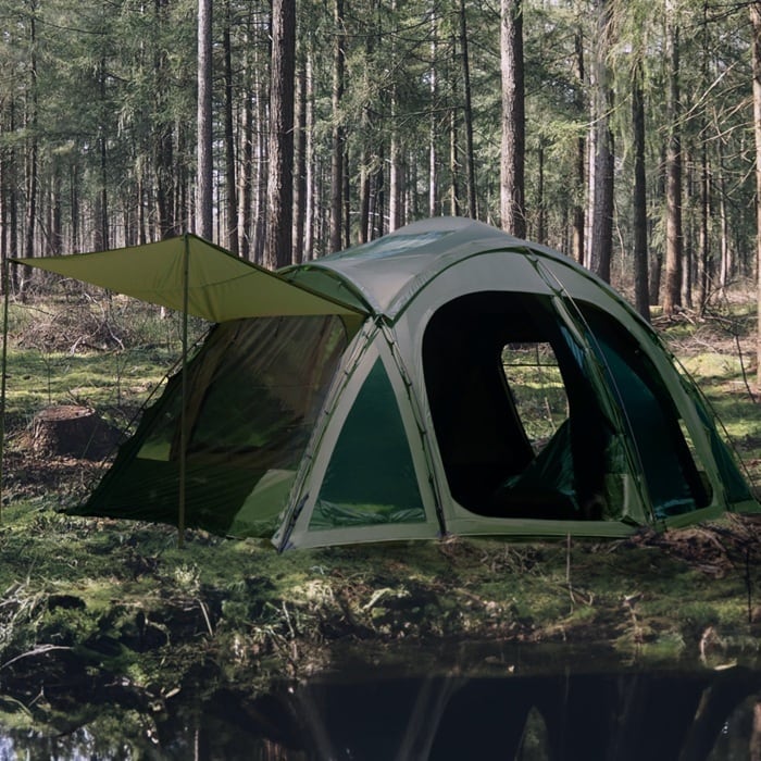 2人以上のキャンプに適した5×4mの大きなサイズと10個のメッシュドア、2.4mの高さの天井による開放感に優れたテントです。精密計算したポールの構造と、曲率が空間活用と構造の安定性を極大化し、職人が丁寧に生地の美しさを極大させる立体角度を具現化させました。
