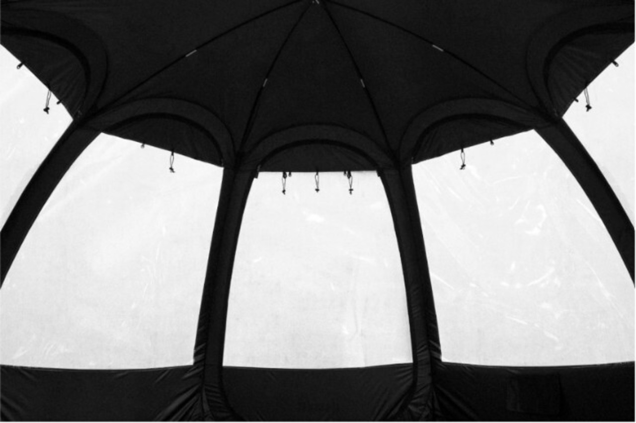 フライの前後面ドアはウェビングを使用したり、お手持ちのポールを利用したりすれば、オーニングとしても使用できます。残り6つの面は、カーテン式で開閉できるので使いやすく、様々な演出が可能です。