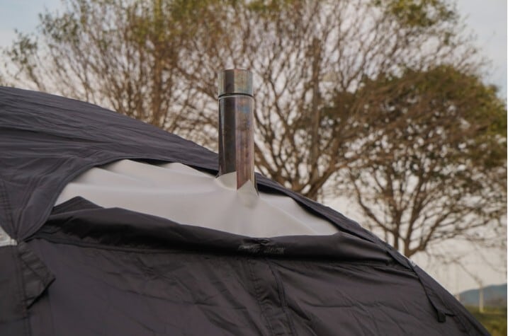 ストーブ使用時の排気用ホールジャックがあり、インナーの開閉が可能なメッシュ窓の位置にフライのホールジャックを位置させた後、インナーメッシュとフライ外部の生地を開けて防炎生地に孔をあけて使用することが可能です。