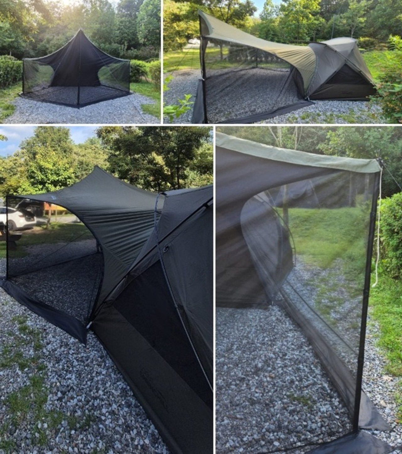 タープにジッパーで連結し使用するスクリーンウォールで、フルメッシュモードにすることができます。メイン高さ2.4Mサイド1.5M基準です。上部と左右はフルメッシュで製作され、出入り口は磁石で開け閉め可能です。 スカート部分は、ペグで固定できるようになっています。