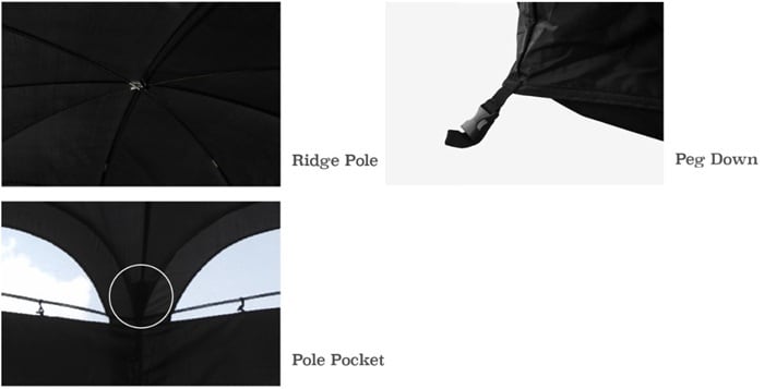 365×365×210cmの広い面積と、4つのリッジポールを使用した広い天井はシェルター内でも十分に活動でき、圧迫感が無く快適に過ごせます。天井のリッジポールは中央リングを通過した後、両側をポケットに差し込んで、手軽に設置できます。