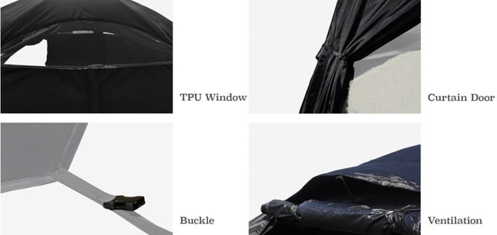 CAMVILのホバクシェルターTPUは、広い内部空間と高い天井でキャンプの時間を快適に過ごせます。360°のTPU窓は開放感にあふれるだけでなく、雪や雨などを防いでくれるので、悪天候でもテントの中から外の景色を楽しめます。ポールの連結が不要な簡単なポップアップ式で誰でも手軽に素早く設置&解体できます。追加購入のサイドウォールを付ければ、プライバシーも保護できます。