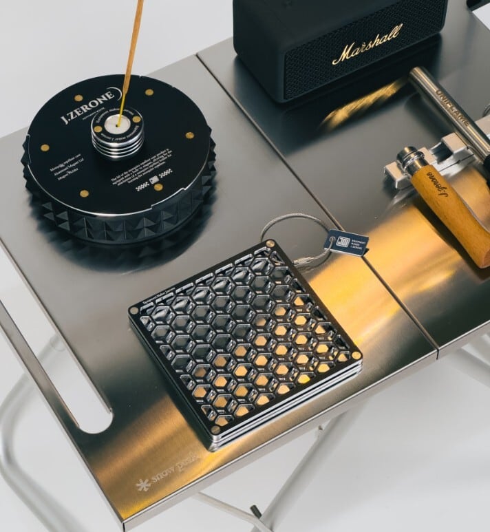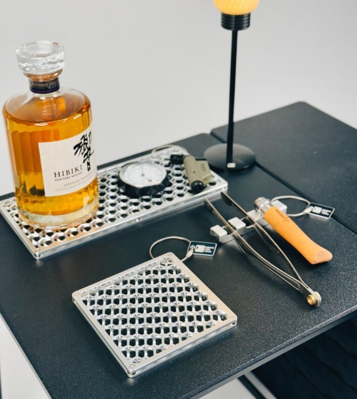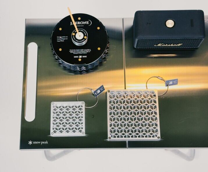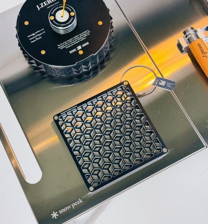 アルミ加工して製作した製品で、2重構造で立体的なパターンと、底面に伝わる熱伝導を最小化したコースターです。