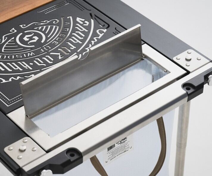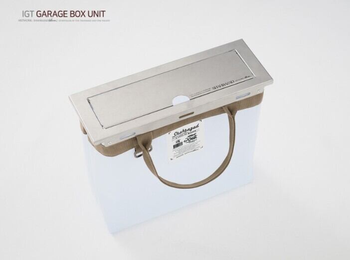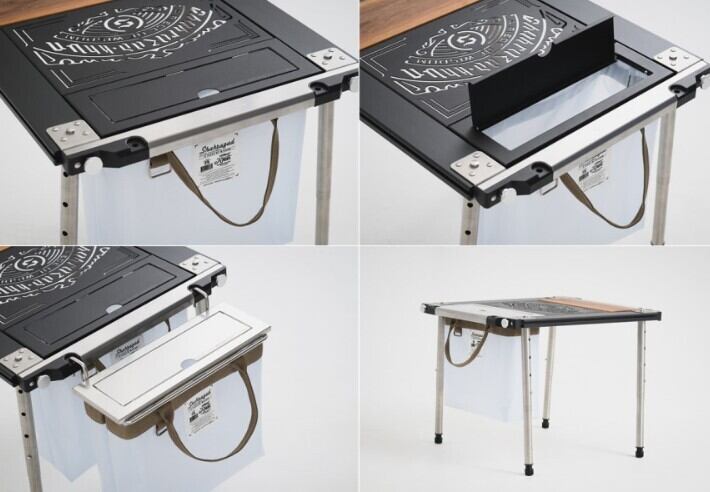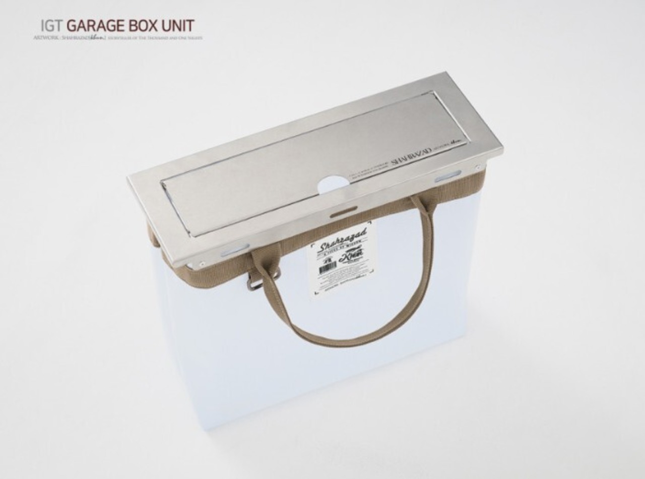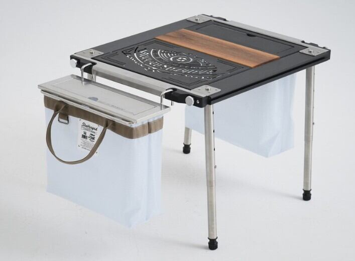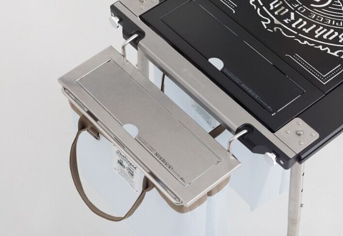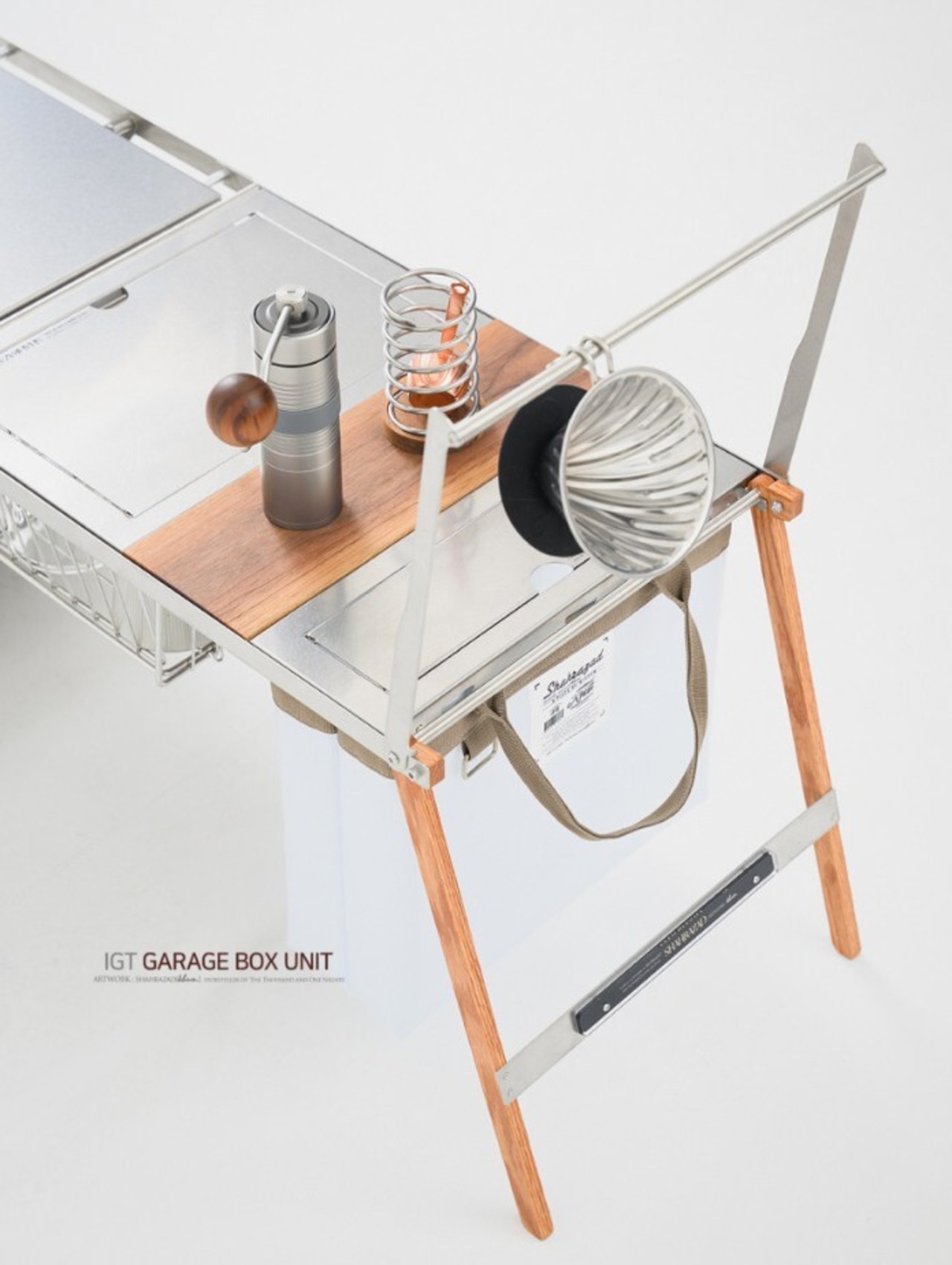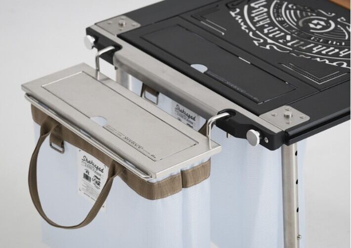 ShahrazadのIGTゴミ箱ハーフユニットサイズです。PVCバックとステンレスの蓋が付いていて使いやすいです。シンプルなデザインで、どんなキャンプアイテムにも馴染みやすく、IGTハーフユニットサイズで様々なシーンで使用できます。