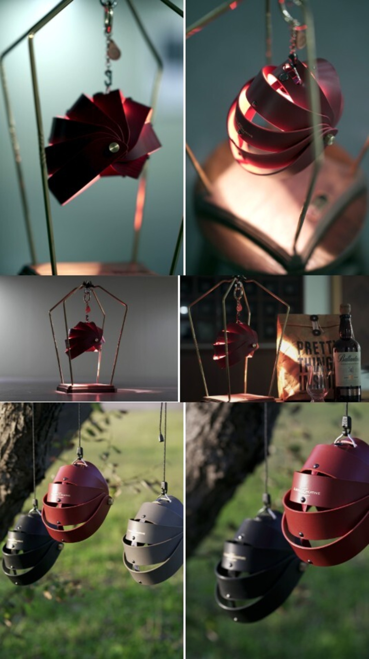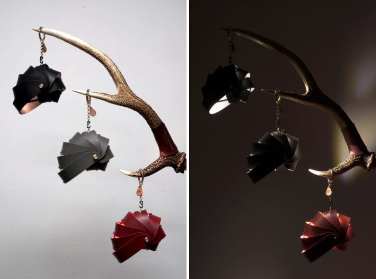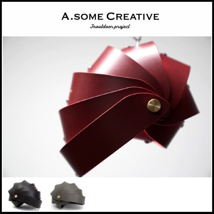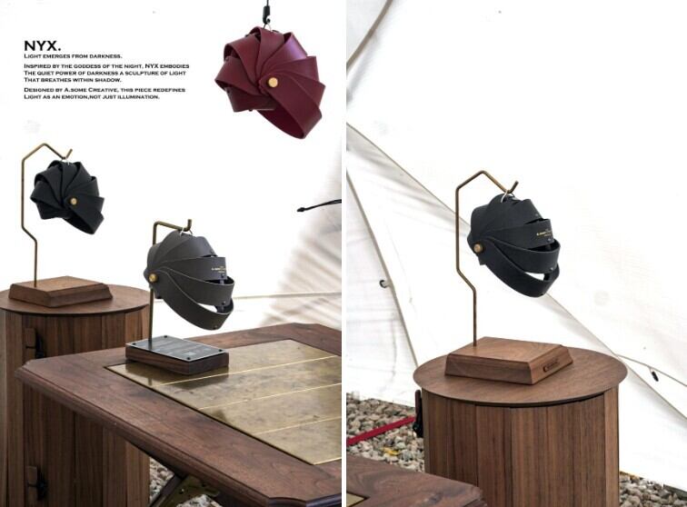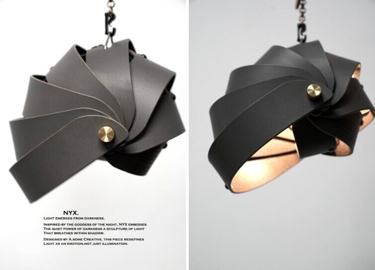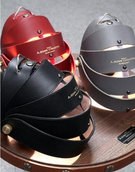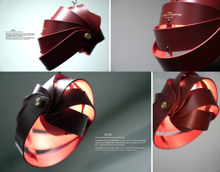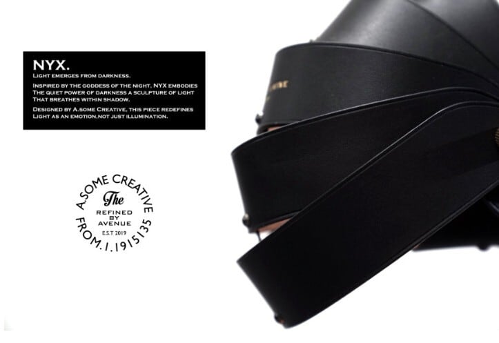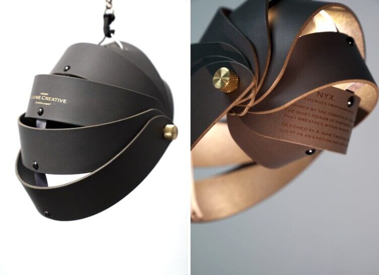 イタリア産ベジタブルレザーで製作したNXYレザーシェードは、光と影が交差して光を抱くようなデザインで照明の美しさを際立たせた、 A.SOME.CREATIVEのデザインコンセプトオブジェです。