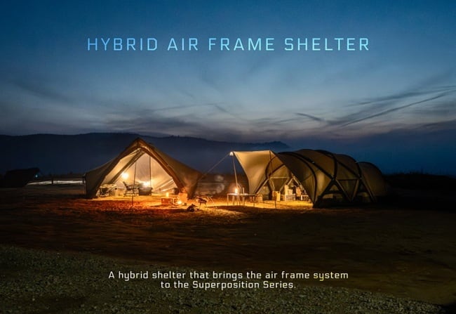 スーパーポジションのスケールが変わります。A型ポールの安定した構造にTPUエアフレームを加え、さらに拡張されたアウトドアシェルターとして新たに完成しました。