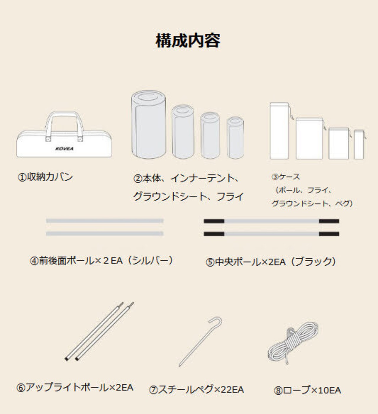 セット内容:本体、インナーテント、ループ、グラウンドシート、前後面ポール×2EA、中央ポール×2EA、アップライトポール2EA、スチールペグ×22EA、ストリング×10EA、収納ケース