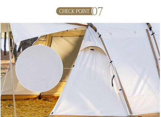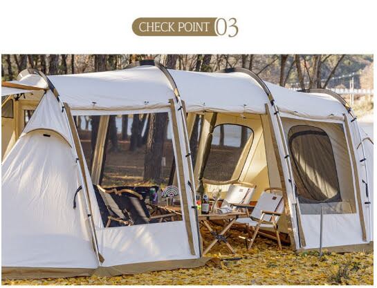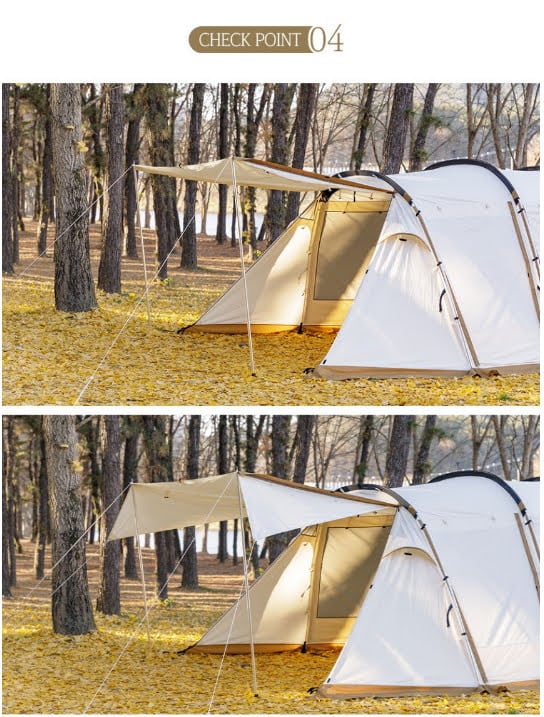側面アップライトを利用して側面ドアを開放でき、快適で実用性の高いテント