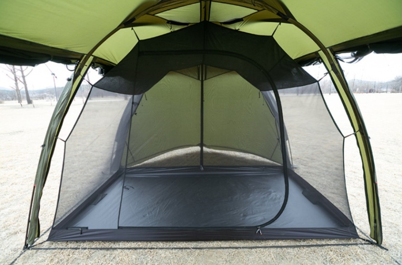 前後面・側面のスキンは開け閉めが自由にでき、スキンとメッシュスキンの二重構造でメッシュスクリーンからタープスクリーンとテント、冬季のシェルターまで四季全て使える全天候モデルです。