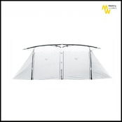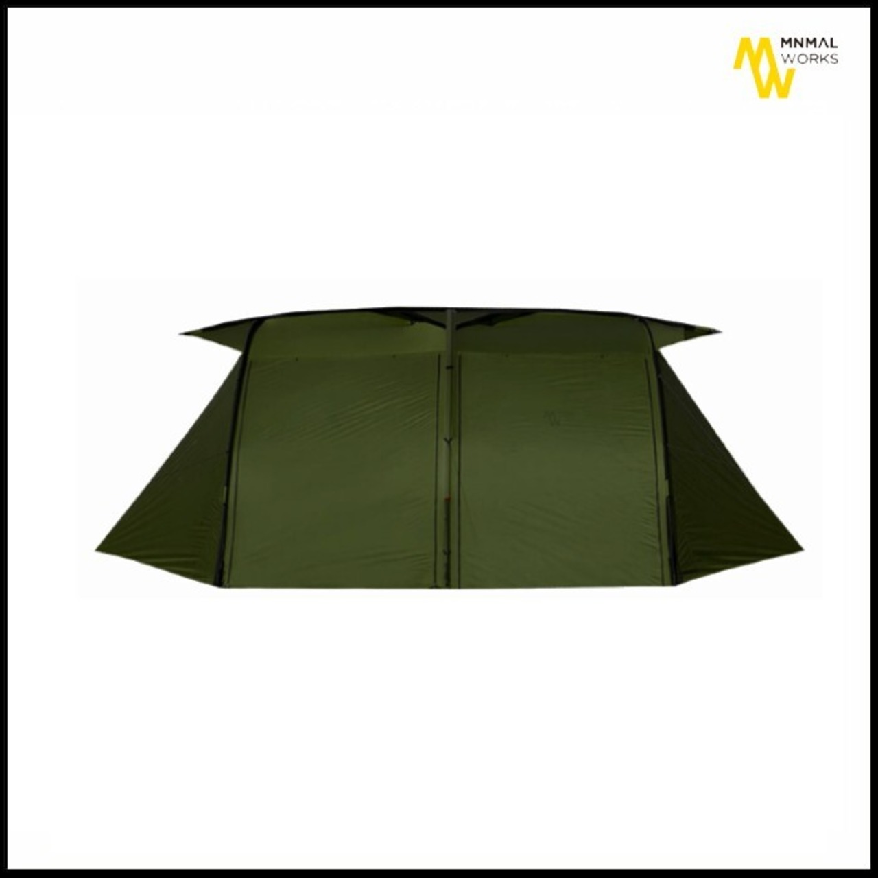 VハウスMドアスキンにポールを追加し設置する場合、タープ役割を兼ねることができ開放して拡張したVハウスMを作る事が出来ます。