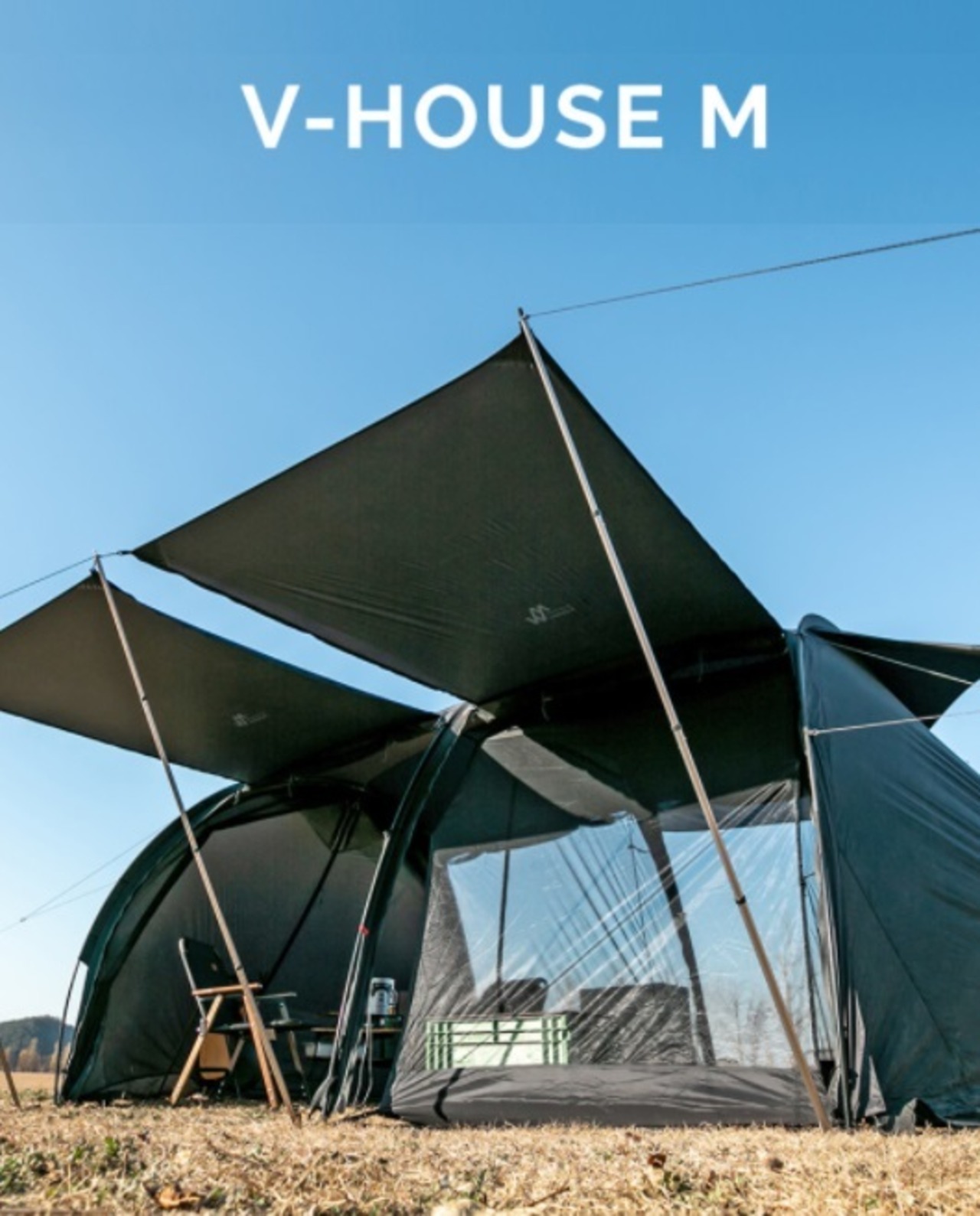 流線型構造のVハウスMは1つのリッジポールと3つのポールからなるシェルターで風からの抵抗力が高く、4つのドアスキンは開け閉めが自由で長方形の床構造は高い空間活用が可能です。