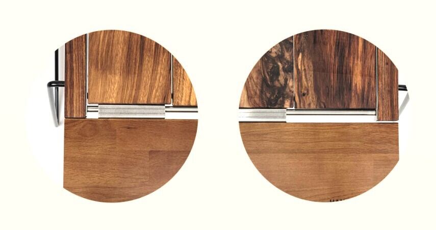 ②拡張テーブルを定位置にそのまま設置しようとすると、テーブルのウッドフレームとぶつかり設置がうまくいかない為、定位置から横に少しずらした位置にブラケットを垂直方向にはめた後、定位置までスライドさせ、設置します。