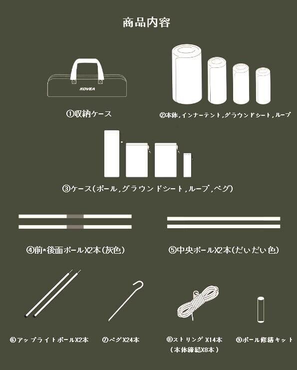 セット内容:本体、インナーテント、ループ、中央ポール×2EA、前後面ポール×2EA、アップライトポール2EA、グラウンドシート、スチールペグ×24EA、ストリング×14EA(本体付属8EA)、収納ケース