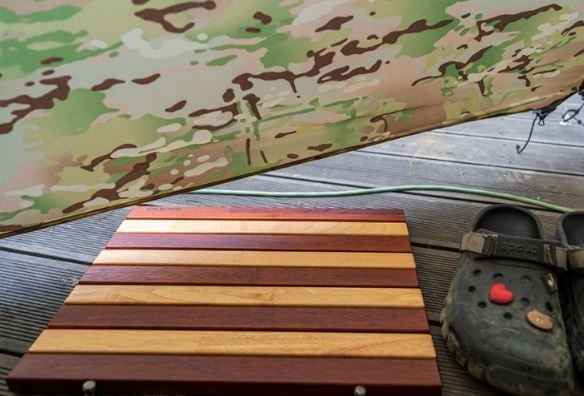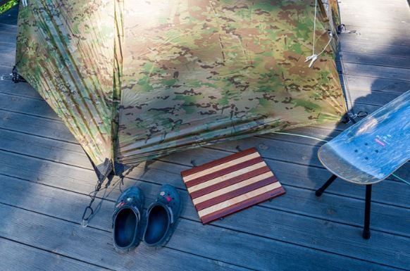 焚き火鑑賞や料理する時に靴を脱いでくつろいだり、