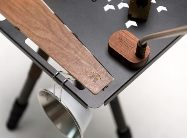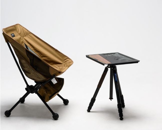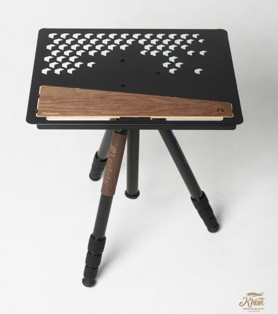 お手持ちのカメラの三脚やランタンスタンドなど、1/4ボルト、3/8ボルトのスタンドと連結し、テーブルとして使用できる天板です。