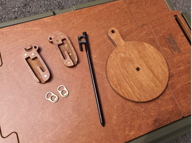 ウッドカバー片方にペグをはめ、片方に缶プルタブ2つをはめて下さい。プルタブの荒い面を互いに合わせてはめ込むと、蚊取り線香をかけた時に片方に傾かず、水平にかけられます。