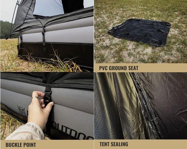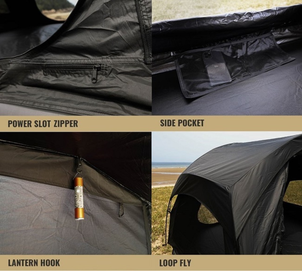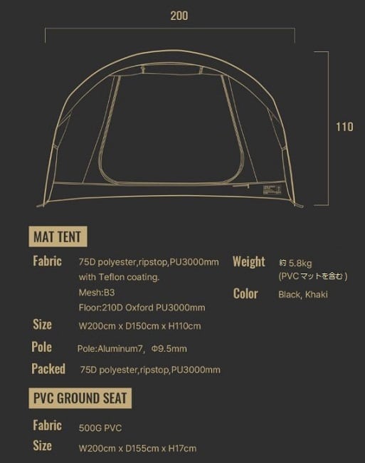 全体スキンは75Dポリエステル、リップストップ、PU3000mmテフロンコーティング加工で、雨天時も単独で使用でき、専用ルーフフライとPVCグランドシートがセットになっています。