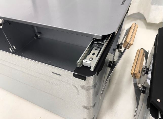 取り付けは容易で、しっかりと固定でき、転倒防止フック付きなので倒れにくいです。スライドレール装着時、コンテナから約10mmほど高くなります。