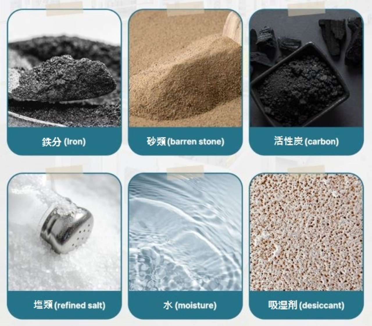 成分:鉄分/水/砂類/活性炭/塩類/高級水性樹脂